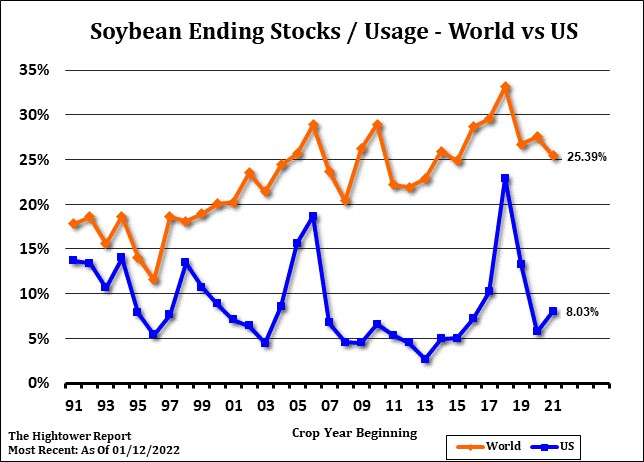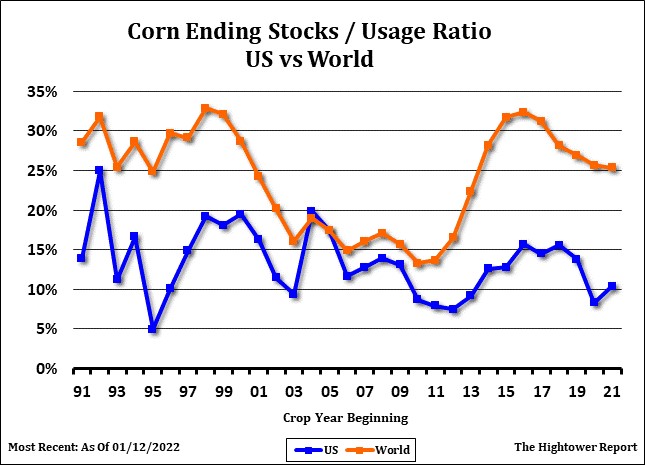Corn closed lower. There may have been some long liquidation before tomorrow USDA report. Lower than expected Dec 31 Canada wheat stocks may have also triggered some long corn short wheat spreads. Corn bulls may have run out of new bullish news before the USDA February crop report and Conab’s South America crop update. The noon SA weather maps showed increase chances for rain across the dry areas of S Brazil, Argentina and Paraguay. The maps may be too wet. Lower energy prices may be weighing on corn. CH failed to trade over Mondays high. CH has had an inside day. The gap from Mondays higher trade is near 6.23. Trade estimates US 2021/22 corn carryout at 1,512 mil bu vs USDA 1,540. This may not satisfy the bulls. Most private estimates are closer to 1,200. Trade also estimates Brazil soybean crop at 133.6 mmt vs USDA 139.0, Argentina soybean crop at 44.5 mmt vs USDA 46.5. Most looking for confirmation of lower SA corn crop and higher US corn export demand. Some also are afraid to add to positions given uncertainty over potential war in Ukraine and stoppage of Black Sea corn exports especially Ukraine corn.