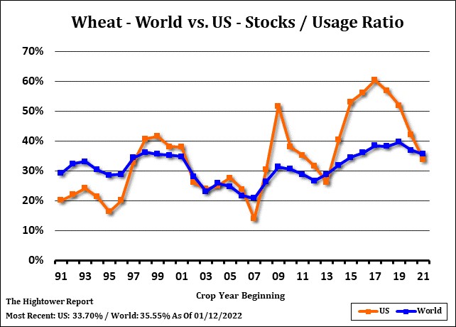Wheat futures ended higher led by Minneapolis spring wheat. Wheat futures trade remains choppy depending upon whatever the headline is. Today, fact Stats Canada estimated Canada Dec 31 wheat stocks at 15.5 mmt vs 17.3 expected and 24.0 last year rallied MWH from 9.09 to 9.41. Since the July, 2021 low near 6.00 KWH has had 4 peaks and 4 valleys. Recent range has been 7.50-8.50. Some are afraid of the uncertainty over will Russia invade Ukraine or not. Some feel Russia may not invade until after the China winter Olympics or if West agrees not to let Ukraine in NATO. Noon maps reduced rains forecasted for US south plains. Trade estimates US 2021/22 wheat carryout at 629 mil bu vs USDA 628. Some private estimates are closer to 700 due to lower exports. Bulls hope USDA lowers World supplies and raise export trade which would lower World stocks. US south plains and N Africa weather remains dry.