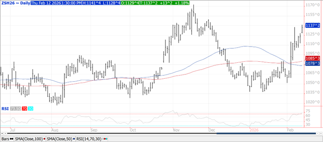 Prices were higher across the complex with beans up $.06-$.13 led by old crop futures. Meal was $2-$5 higher while oil was up 30-50 points. Spreads strengthened all around. Fresh 2 ½ month high for Mch-26 soybeans with next resistance at the Dec-26 high just below $11.50. New contract high for Mch-26 oil while so far holding just below the Aug-25 high at $.58 lb. on the spot weekly chart. Mch-26 meal traded to a 7 week high. Reports from Chinese media that Pres. Trump and Chinese leader Xi would meet in Beijing in April helped stimulate higher trade across the Ag. space today. Spot board crush margins improved $.03 to $1.73 bu. with bean oil PV slipping to 48.3%. Conab raised their production forecast nearly 2 mmt to 178 mmt, still below the USDA est. of 180 with many private forecasts in the mid 180’s. Higher yields more than offset slightly lower acres. The RBOT raised their Argentine production forecast 1 mmt to 48 mmt while citing anticipated rains over the next 2 weeks will be critical for crop development. Brazilian FOB offers remain $.80-$1.00 below US Gulf thru May. Export sales at 10 mil. were at the low end of expectations. YTD commitments at 1.270 bil. are down 20% from YA vs. the USDA forecast of down 16%. Sales to China at 286k mt (most switched from unknown) bring total commitments to 10.2 mmt with another 2.74 mmt left to unknown. Shipments to China are early 5.1 mmt. The USDA reported a flash sale of 108k my (4 mil. bu.) to Egypt. Meal sales at 357k tons brought YTD commitments to 10,001k tons up 9% YOY vs. the USDA forecast of up 5%. Bean oil commitments at 746 mil. lbs. are down 50% YOY in line with the USDA forecast. Chinese crush margins from imported soybeans remain positive only for imports from Brazil. US soybean acres in drought increased 3% to 37%.