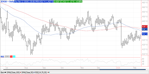 Prices were $.03 ½ – $.05 ½ higher, closing at session highs. Spreads weakened however. Next resistance for Mch-26 is this month’s high at $4.36. Prices remain rangebound between $4.15-$4.40. Yesterday’s EPA data showed ethanol production rebounding to 326 mil. gallons, up 2.6% YOY and above the pace needed to reach the USDA usage forecast of 5.60 bil. bu. Conab lowered their Brazilian production forecast .5 mmt to 138.45 mmt, still well above the USDA forecast of 131 mmt. The 2nd crop was trimmed 1.2 to 109.26 mmt due to reduced acres. The Rosario Board of Trade kept their Argentine production forecast unchanged at 62 mmt, well above the USDA est. of 53 mmt. Export sales at 82 mil. bu. were above expectations. YTD commitments at 2.394 bil. bu. are up 31% from YA, vs. the revised USDA forecast of up 15.5%. Noted buyers were Japan – 24 mil., Korea – 13 mil., Colombia – 11 mil. and Mexico – 8 mil. US corn acres in drought rose 2% to 31%.