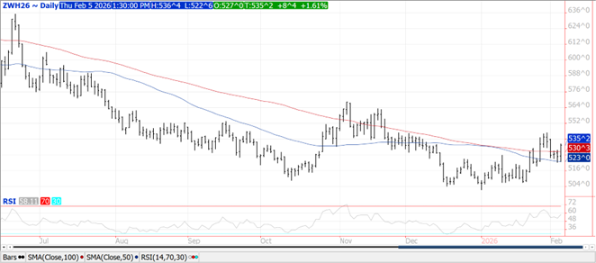 Wheat got caught up in the bullish draft with prices up $.05-$.09 today.  Prices weren’t impacted by Pres. Trump’s Truth Social post yesterday.  CGO Mch-26 popped back above its 100 day MA with next resistance at LW’s high of $5.44 ¾.  KC Mch-26 held MA support at $5.26 ½ in overnight trade setting up the midday recovery.  The 6-10 and 8-14 day outlooks continue to call for above normal precipitation in winter wheat areas however so far these rains haven’t moved forward.  Exports at 14 mil. bu. were in line with expectations bringing YTD commitments to 802 mil. bu. up 18% from YA, vs. the USDA forecast of up 9%.  Commitments represent 89% of the USDA forecast, above the historical average of up 83%.  By class commitments vs. USDA forecast are HRW +78% vs. USDA +47%, SRW +4% vs. -2%, HRS down 6.5% vs. -8%, and white down 1% vs. -5%.  US winter wheat acres in drought rose 2% to 43% nearing the 52 week high of 45%.