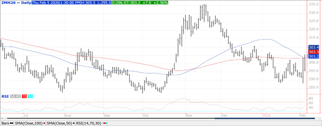 Prices were mostly higher across the complex with beans up $.10-$.21, meal surged $6-$7 while oil was steady.  Bean and oil spreads were mixed while meal spreads firmed.  Despite being $.20 higher Mch-26 beans held within yesterday’s range.  After trading to a fresh 5 ½ month high overnight, Mch-26 oil failed to trade above $.56 lb. setting up the price pullback.  Mch-26 meal surged to its highest level in a month while closing very close to its 50/100 day MA’s.  Spot board crush margins pulled back another $.04 ½ to $1.67 bu. while bean oil PV slipped just below 48%.  While it may not make economic sense for China to buy more US beans, they did buy 12 mmt Nov-25 thru Jan-26 at prices above what they could have secured from Brazil.  Price volatility likely to remain high leading up to EPA decision on RVO’s and SRE’s in March and Trump’s visit to China in April.  Addition Chinese buying, or lack thereof, along with price differentials between US and SA to drive prices.  Another 8 mmt of old crop soybean sales to China would be a game changer for the US balance sheet.  Instead of looking at a 25-50 mil. bu. reduction, we could be talking about 25-50 mil. bu. increase driving stocks closer to 300 mil. bu. Bean sales at 16 mil. were below expectations.  Commitments at 1.260 bil. are down 20% from YA vs. the USDA forecast of down 16%.  Sales to China at 233k mt (half switched from unknown) bring total sales to 9.9 mmt with another 3.1 mmt to unknown.  Shipments to China are just over 4.3 mmt.  Meal sales at 380k tons brought YTD commitments to 10,651k tons up 9% YOY vs. the USDA forecast of up 5%.  Bean oil commitments at 742 mil. lbs. are down 50% YOY in line with the USDA forecast.  Brazilian exports in Jan-26 at 1.88 mmt vs. only 1.07 mmt YA.