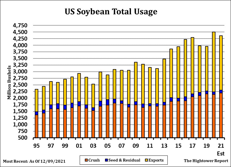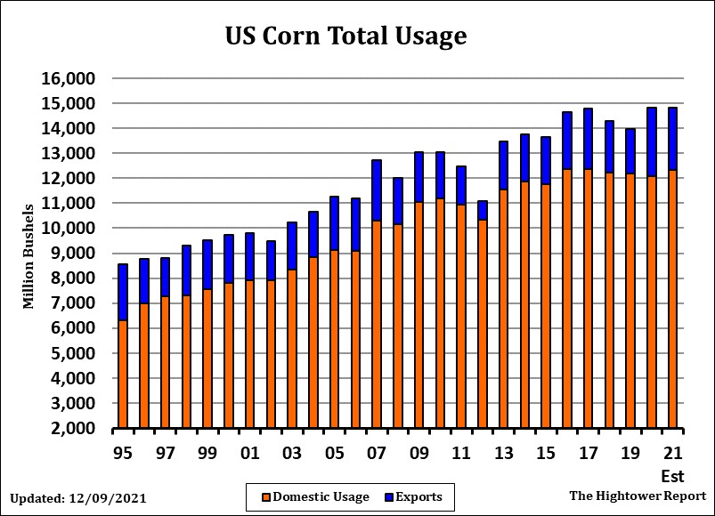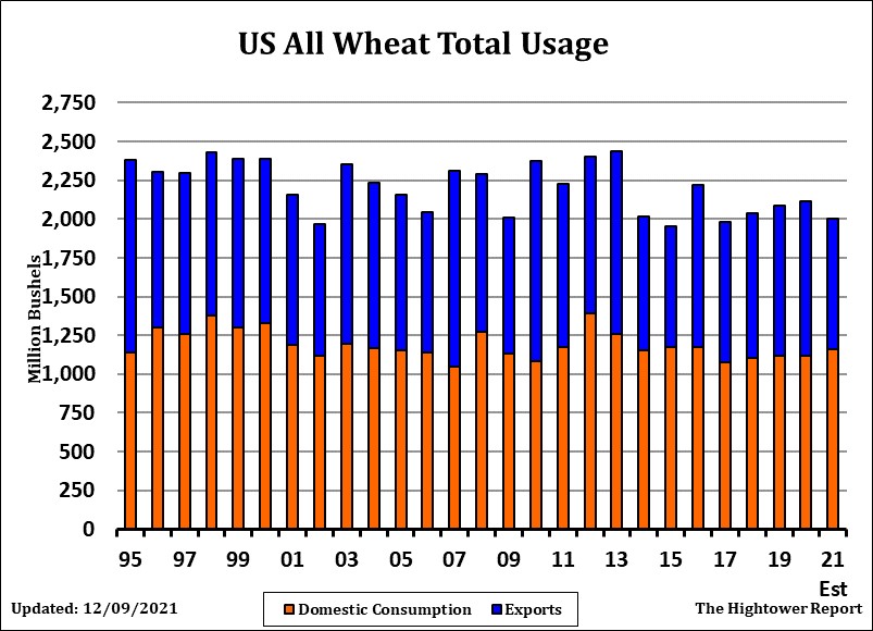 Wheat futures ended mixed. WH ended near 7.62 up 3 cents. KWH ended up 3 cents and near 7.78. MWH ended lower and near 9.13. MWH continues to lose vs KC as the market shifts from last years lower US and Canada spring wheat crops to concern about US HRW crop conditions. Weekly US wheat exports were 8 mil bu vs 10 last year. Season to date exports are 456 mil bu vs 562 ly (-106) USDA goal is 840 vs 992 ly (-162). USDA could lower US exports this week. Wheat trade continues to trend lower on slow US wheat exports, higher US Dollar and talk USDA could increase US 2022 winter wheat acres on Wednesday. Trade estimate US 2022 Winter wheat acres at 34.3 million vs 33.6 last year. Trade also estimates US 2021/22 US wheat carryout near 608 mil bu vs 598 previous. Trade also estimates World 2021/22 wheat end stocks near 278.6 mmt vs 278.2 previous. Trade also estimates US Dec 1 wheat stocks near 1,421 mil bu vs 1,703 ly.