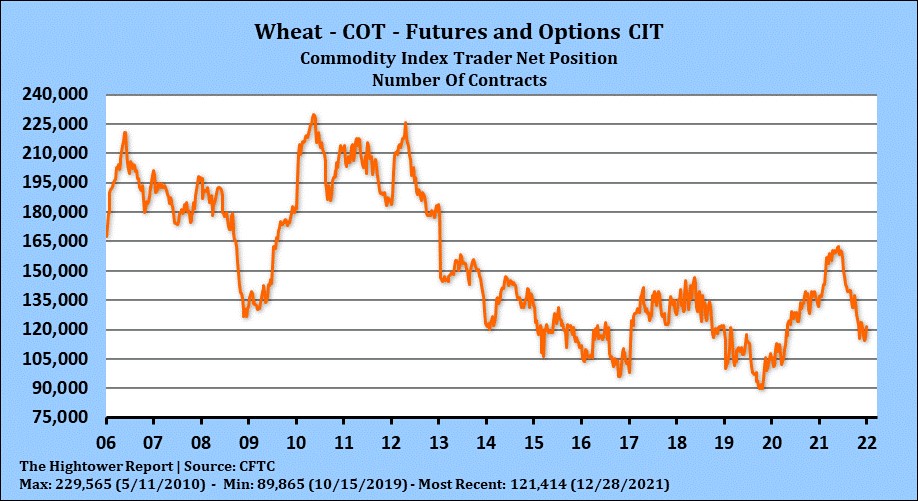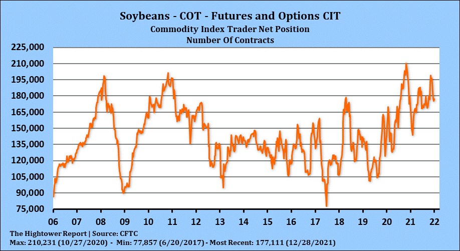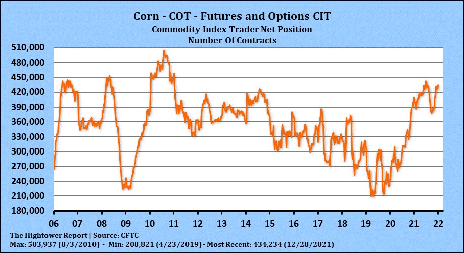 Mixed trade in soy complex. Soyoil gained on soymeal on new speculative buying soyoil. Some feel higher palmoil prices could increase demand for US soyoil. There is also talk that US 2022 demand for soyoil biofuel will increase. Soybeans are supported by warm and dry weather forecast for S Brazil and Argentina and wet forecast for NE Brazil. Weekly US soybean export sales are est near 400-1,300 mt vs 524 last week. Trade will have to decide soon if SH needs to trade over 14.00 to ration demand or trade lower into and after USDA report to buy new soybean demand. Funds have been net sellers 3,000 soymeal and bought 3,000 soybeans and 5,000 soyoil. We estimate Managed funds to be net long 107,000 soybeans, 53,000 soymeal and 51,000 soyoil. Index fund rebalance starts Monday. Funds will buy 21,000 soybeans, 24,000 soymeal and sell 6,000 soyoil over 5 days. All during USDA report.