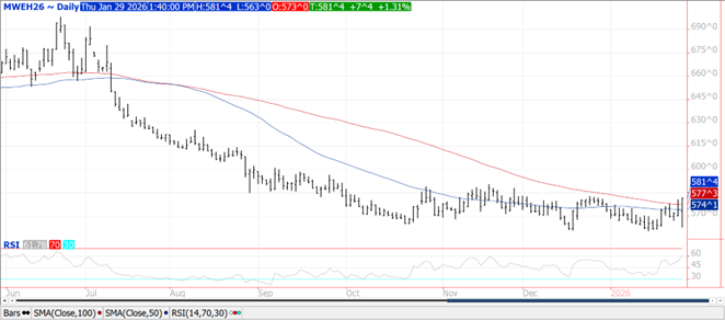 Prices were $.05-$.08 higher across the 3 classes.  CGO Mch-26 jumped out to a 2 month high while also reaching our objective of $1.10 over Mch-26 corn futures.  KC Mch-26 also traded to a fresh 2 month high with next resistance at $5.53 ½.  Huge range in Mch-26 MIAX as prices closed at session highs up $.07 ½.  O.I. in CGO rose just over 4.5k contracts yesterday after speculative traders bought 7k contracts indicating fresh money coming in the long side of the market, not just a speculative short covering rebound.  O.I. in KC little changed at down 500 contracts.  Export sales at 21 mil. bu. were in line with expectations bringing YTD commitments to 788 mil. bu. up 18% from YA, vs. the USDA forecast of up 9%.  By class commitments vs. the USDA forecast are HRW +84% vs. USDA +47%, SRW +8% vs. -2%, HRS down 9% vs. -8%, and white down 1% vs. -5%.  Monthly census exports from Nov-25 at 60 mil. bu. were 5 mil. above implied inspection data.  Cumulative sales in 6 months of the 25/26 MY at 501 mil. bu. are up 21% YOY vs. the USDA forecast of up 9%.  To reach the USDA forecast sales over the 2nd half of the MY need to reach 399 mil. bu. vs. 403 mil. YA.