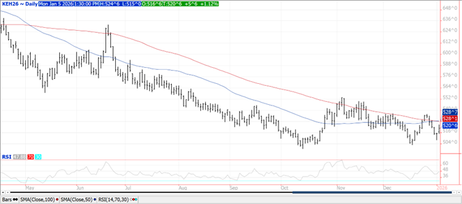 Prices ranged from steady to $.06 higher across the 3 classes with KC and CGO futures the leaders to the upside. Mch-26 KC has 50 and 100 day MA resistance starting at $5.28. Mch-26 CGO continues to recover after holding support above $5.00 LW. Export sales at 3.5 mil. bu. bring YTD commitments to 735 mil. bu. up 18% from YA, vs. the USDA forecast of up 9%. Commitments represent 82% of the USDA forecast, above the historical average of 75%. By class commitments vs. the USDA forecast are: HRW up 83% vs. USDA up 49%, SRW up 7% vs. up 2.6%, HRS down 8% in line with USDA, and white up .5% vs. down 10%. Wheat inspections at 7 mil. bu. were below expectations and below the 16 mil. bu. needed per week to reach the USDA forecast. YTD inspections at 561 mil. bu. are up 20% from YA.