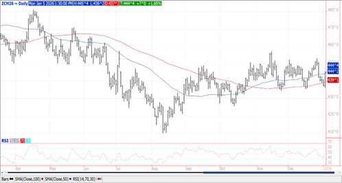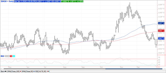 Prices were $.05-$.07 higher with spreads also firming. Mch-26 closed back above both its 50 and 100 day MA’s while still holding in a $4.35-$4.55 range. Corn used for ethanol slipped to 472 mil. bu. in Nov-25, in line with expectations. In Q1 of the 25/26 MY usage has reached 1.382 bil. bu. matching the YA, while the USDA forecast is for a 3% increase. Export sales at 30 mil. bu. were a MY low bringing YTD commitments to 1.990 bil. bu. up 30% from YA, vs. the USDA forecast of up 12%. YTD commitments represent 62% of the USDA forecast, above the historical average of 53%. Export inspections at 48 mil. bu. were a MY low however in line expectations and below the 61 mil. needed per week to reach the USDA forecast. YTD inspections at 1.056 bil. are up 65% from YA. Noted takers were Japan – 12 mil. and Mexico with 9 mil.