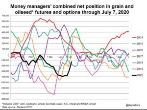Corn futures traded sharply lower. Managed funds were sellers of 14,000 corn. Managed funds are net short 177,000 corn. At one point before the USDA June acreage report funds were net short 320,000 corn contracts. After today’s USDA supply and demand report corn futures traded lower. Some feel that funds did not want to be long futures if the 2 week American model is correct and US Midwest rainfall will be normal. Others fear that resurgence of the virus in the US will slow food demand. As expected USDA dropped US 2020 corn acres to 92.0 million. They left the yield unchanged at 178.5. This reduced the crop to 15,000 mil bu from 15,995. USDA also dropped US 2019/20 feed and ethanol use. This raised the US 2019/20 carryout to 2,248. USDA also dropped 2020/21 feed use. All of this dropped US 2020/21 corn carryout from3,323 to 2,648. Drop in US crop size dropped World 20/21 corn end stocks to 315.0 mmt versus 337.8 previous and 297.0 last year. The World carryout is still adequate for demand. USDA estimates World corn trade near 182 mmt. US is 54, Brazil 38, Ukraine 37 and Argentina 36. It will take hot and dry Midwest weather over the next 3 weeks to lower the US crop enough to push prices higher. Fact USDA announced 1.3 mmt US corn sold to China today failed to support prices.