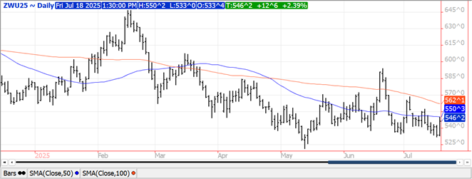 Prices were higher across the 3 classes today with HRW and SRW both up $.11-$.13. Sept-25 CGO has topped out right at its 50 day MA at $5.50 ¼. Resistance for Sept-25 KC is at $5.41 ½. MIAX spring wheat futures lagged closing up only $.01 as rains in the N. Plains will help production prospects. US winter wheat harvest is winding down in the S. Plains. The last CFTC report showed MM’s net short 43k contracts in KC-HRW, short 56k in CGO-SRW while long 2k in MIAX, which may also help explain today’s price action. Ukraine’s 2025 grain harvest has reached 7.2 mmt, of that 4.67 mmt is wheat and 2.18 mmt of barley.