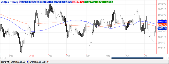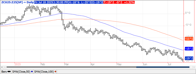 Prices closed $.06-$.07 higher today. Spreads however continue to weaken with Sept/Dec reaching a new low at -$.20. Dec-25 worked its way back into the gap left from the sharply lower open on July 7th. Trade up to $4.32 ¾ is required to fill the gap vs. today’s high of $5.30 ¼. Next resistance at the 50 day MA of $4.35. Weather right now is outweighing recent bearish demand news. Yesterday export sales were lousy, this while the Trump Admin. works to lower the consumption of corn syrup in the US. There has been some evidence of pollination issues across portions of the Midwest due to lack of nighttime cooling with the current forecasts not ideal for the later developing crop or kernel fill. IMO at recent lows the market was factoring in yields near or above 185 bpa. Late yesterday the BAGE reported Argentine harvest advanced 9% LW to 79% complete. They left their production forecast unchanged at 49 mmt, vs. the USDA at 50 mmt. With Brazil’s 2nd crop harvest slower than usual I’d expect further production increases in future USDA reports much like 2 years ago.