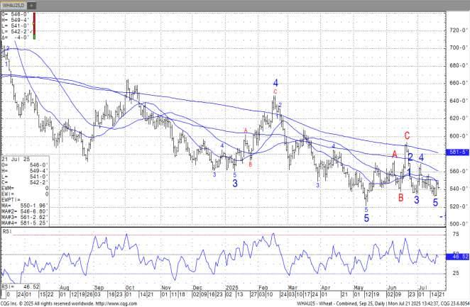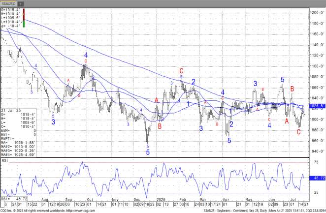 SU ended near 10.09. Soymeal is below 275. World soymeal basis levels are sharply lower on too much supply. Soyoil ended higher on talk of increase demand. Weekly US soybean exports were 364 mt and at the mid point of trade estimate. Total exports near 46.7 mmt vs 42.3 ly. USDA goal is 50.7 mmt vs 46.2 ly. USDA estimates total World 2024/25 soybean exports at 180.6 mmt vs 177.7 ly. USDA est China imports at 106.5 mmt vs 112.0 ly. June China soybean imports were 12.2 mmt or up 9 pct vs ly. China continues to buy Brazil soybeans. USDA est Brazil 24/25 soybean crop at 169 mmt with exports at 102.1. USDA est Brazil 25/26 soybean crop at 175 mmt with exports at 112.0 mmt. US farmers remain reluctant sellers of new crop soybeans.