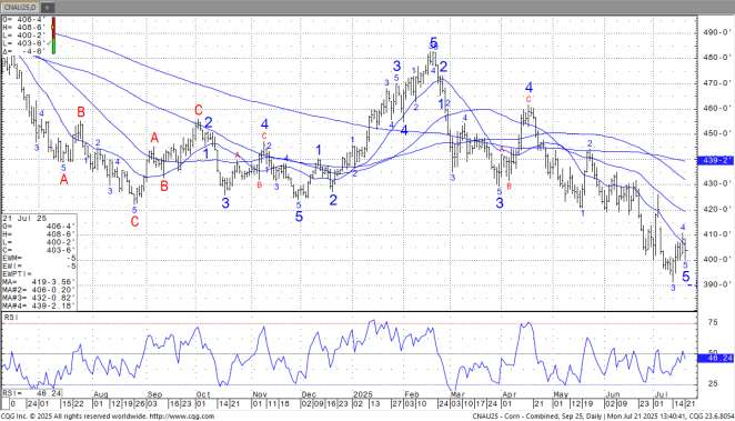 CU ended near 4.03. Weekly US corn exports were 983 mt and below the lower end of trade estimate. Total exports are near 58.8 mmt vs 45.6 ly. USDA goal is 69.8 mmt vs 57.2 ly. USDA estimates total World 2024/25 corn exports at 192.5 mmt vs 192.5 ly. USDA est China imports at 5.0 mmt vs 23.4 ly. USDA estimâtes Brazil 24/25 corn exports at 43.0 mmt vs 38.2 ly. This includes a Brazil crop est of 132 mmt vs 119 ly. USDA est Brazil 2025/26 corn crop at 131 mmt with some est closer to 134. US farmers remain reluctant sellers of new crop corn.