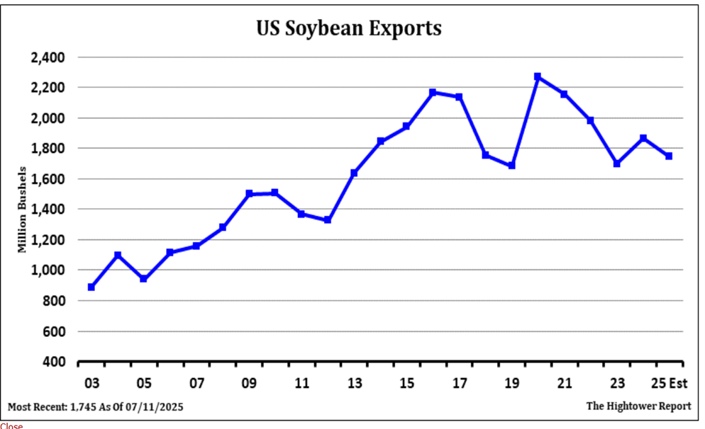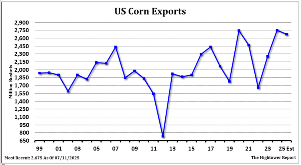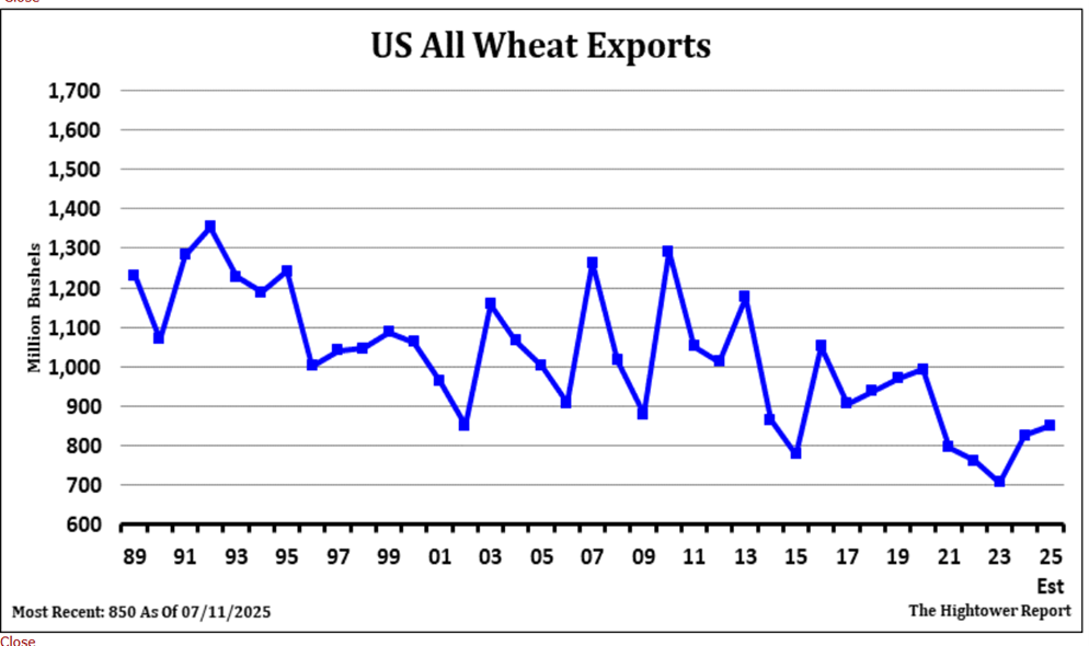 SU ended near 10.05. Soymeal is near 276. BOU is near 56 cents. World soymeal basis levels are lower on too much supply. US farmers remain reluctant sellers of new crop soybeans. SU is now below all key moving averages. Volume has increased over the last few trading days. Some look for SX to test 8.60 as harvest low as long as US Midwest weather remains favorable. Trade est US weekly old crop soybean export sales at 60-350 mt vs 97 last week and new crop at 250-800 mt vs 565 last week. USDA est World exports at 180 mmt vs 177 last year. US is 50 mmt vs 46 last year. Brazil exports are est near 102 mmt vs 104 ly. USDA also est 25/26 World exports at 187 mmt. US is 47 with some as low as 43. Brazil is 112 mmt and assumes a crop at 175 mmt. Trade will be watching US tariffs especially EU and China closely.