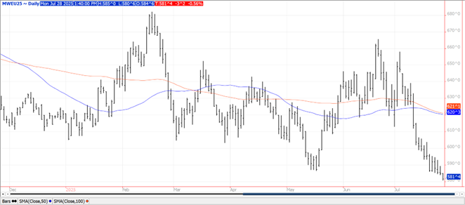 Prices finished mixed with Chicago and KC futures within a penny of unchanged in 2 sided trade. MIAX futures were down $.02-$.03. Spreads were also very little changed. Sept-25 CGO held support just above this month’s low at $5.32. New contract low for Sept-25 MIAX with consecutive lower closes. The US $$$ index was sharply higher surging thru its 50 day MA resistance. Export inspections slipped to 11 mil. bu., below expectations and below the 16 mil. needed to reach the USDA forecast. YTD inspections at 122 mil. bu. are up 6% from YA, in line with the USDA forecast. MM’s last week were net buyers of 8.4k contracts of CGO, 4k contracts of KC while sellers of 10.3k contracts of MIAX.