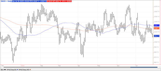 Prices are mostly lower across the complex with beans down $.08-$.10, meal was off $2-$3 while oil was a few ticks higher. Bean and meal spreads weakened while oil spreads were mixed. Aug-25 beans have slipped to a 3 ½ month low with next support at $9.82 ¾. Nov-25 beans slipped to its lowest level in nearly 2 weeks with next support at $9.98 ¼. Inside trade for Aug-25 oil as it consolidates just below the July high at 57.17. Aug-25 meal barely held support above its contract low at 264.50. Spot board crush margins jumped another $.04 to $2.16 per bu., the highest in a year. Bean oil share reached a fresh modern day high of 51.6%. New crop crush margins increased $.04 to $2.18 ½ bu. The US/EU reached a trade agreement yesterday that reduced tariffs on imports from the EU to 15%, half of what the Trump Administration threatened. Specifics on the sale of US Ag. goods are lacking. US Treasury Sec. Bessent met again today with his Chinese counterpart in Sweden to discuss trade. The most likely outcome is another 90 tariff truce which IMO is viewed as price negative, particularly for soybeans as large purchases of US Ag. goods are seemingly being kicked down the road. Still no Chinese soybean purchases on the books for the 25/26 MY. Markets seem to be gearing for a direct meeting between Pres. Trump and Chinese leader Xi sometime this fall. Export inspections at 15 mil. bu. were at the high end of expectations however below the 17 mil. needed to reach the USDA forecast of 1.865 bil. YTD inspections at 1.734 bil. are up 10% from YA, in line with the USDA forecast. Egypt was the largest taker at nearly 6 mil. bu. MM’s bought just over 21k contracts of soybeans, 12k oil and nearly 3.3k meal. As of last Tues. MM’s were still short 11k contracts of beans, 130k contracts of meal and long 55k contracts of oil. Over the weekend Argentina lowered their export taxes on soybeans to 26% from 33%. Soy products fell to 24.5% from 31% while grain export taxes were trimmed from 12% to 9.5%.