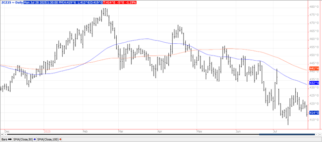 Prices were $.05-$.06 lower today closing near session lows. Spreads were mixed with nearby Sept/Dec widening to a new low at ($.20 ¾). Support for Dec-25 is at its contract low at $4.07 ½. The extreme heat that covers much of the nation’s midsection is expected to ease over the next 24-48 hours. Today’s highs will be in the upper 90’s perhaps even a few 100 degree readings as far north as SD and W. Iowa. By mid-week seasonally normal to below normal temperatures are expected with daily highs in the upper 70’s. Rains over the balance of the week are expected to be heaviest across Iowa, S. MN and E. NE. Export inspections jumped to 60 mil. bu., above expectations and above the 40 mil. bu. needed to reach the USDA forecast of 2.750 bil. bu. YTD inspections at 2.375 bil. are up 29% from YA vs. the USDA forecast of up 22%. Noted buyers last week were Japan with 24 mil. and Mexico with 17 mil. The USDA also announced the sale of 225k mt (9 mil. bu.) of 25/26 MY to Mexico and 229k mt to unknown. Most of the unknown sale was also for the 25/26 MY. Friday’s CFTC report showed money managers were net sellers of 2.6k contracts while index funds sold 1k. AgRural is reporting Brazil’s 2nd harvest has reached 68% as of late last week, well below the 91% pace from YA.