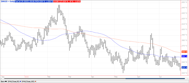 Prices were lower across the 3 classes today ranging from $.04 lower in MIAX to $.09 lower in Chicago. Sept-25 CGO slipped to a fresh 2 ½ month low, next support is the CL at $5.21 ¼. Sept-25 KC held a test of its CL at $5.15. A 5th consecutive day of new contract lows for Sept-25 MIAX wheat. Jordan passed on purchasing wheat from any of the 6 offers in their recent 120k mt tender. EU soft wheat exports for the 25/26 MY thru July 27th at 803.3k mt are down 64% from YA sales at 2.25 mmt. Winter wheat harvest advanced 7% to 80%, just below the 5-year Ave. and YA pace of 81%. Spring wheat conditions fell 3% to 49% G/E, vs. expectations for little change. 92% of the crop is headed vs. 93% YA and the 5-year Ave. of 95%. Overall ratings are just below the 5-year Ave. Harvest is just underway at 1%.
