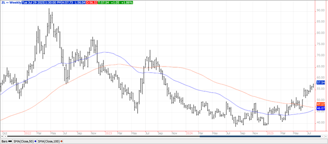 Prices are mostly lower across the complex with beans down $.02-$.07, meal was off another $3 while oil surged into new highs late, closing 75-100 points higher. Bean and meal spreads weakened while oil spreads are firm. The Aug/Sept bean spread has gone from a $.27 premium in early June to a new low today at an $.08 discount. Aug-25 beans slipped to its lowest level since Dec-24. Next support is its CL at $9.64. Support for Nov-25 beans is at its July low at $9.98 ¼. Spot bean oil jumped to its highest level since Oct-23 on the spot weekly chart. New CL and fresh 9 year low for spot meal. Spot board crush margins surged another $.11 today to $2.27 bu., it highest level since Nov-23. Bean oil PV jumped out to a new modern day high at 52.4%. New crop margins improved $.05 to $2.23 ½ bu. Rains over the balance of the week here in the US are expected to favor E. NE across much of Iowa, and along N. IL and N. IN. At midday US Treasury Sec. Bessent indicated his trade talks with Chinese representatives were constructive however Pres. Trump will have final say on whether the tariff truce will be extended for another 90 days from the current deadline of Aug. 12th. This week’s talks didn’t discuss a potential Trump/Xi meeting however they have been expecting to meet in late Oct. in S. Korea. Wire services are reporting that record Chinese soybean imports so far in 2025 combined with recent soybean meal purchases from Argentina have led to a supply glut, suggesting imports from the US will be slow to materialize. So far no US beans have been booked by China for the 25/26 MY. China also reportedly sold 150k mt of bean oil to India for Sept-Dec. shipment at roughly a $20 per ton discount to SA offers. US soybean conditions improved 2% to 70% G/E, better than expectations. Conditions improved in 10 states while declining in 8. Ratings are the highest since 2020. Current conditions would suggest and average yield at just over 53 bpa. Vs. the USDA forecast of 52.5 bpa. 76% of the crop is blooming matching the 5-year Ave. and just above the 75% from YA. 41% of the crop is setting pods, YA and 5-year Ave. of 42%