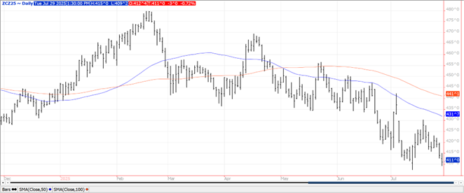 Prices were $.02 ½ – $.04 ½ lower today with spot Sept-25 carving out a new contract low. Spreads also weakened ahead of FND on Thursday. Sept/Dec widened to a new low at ($.22 1/2). Last year Sept/Dec bottomed out at ($.26 ½) in late Aug. Support for Dec-25 is at its contract low at $4.07 ½. US weather remains non-threatening into early August. The extreme heat that’s across the nation’s midsection will ease over the next 24 hours compressing the much above normal temperatures to the deep south. By late this week seasonally normal to below normal temperatures are expected with daily highs in the upper 70’s.Crop ratings slipped 1% to 73% G/E, in line with expectations. Conditions improved in 10 states while declining in 8. Overall ratings remain the highest since 2016. My crop condition model is suggesting an average US yield of 185.3 bpa, well above the USDA at 181 bpa. 76% of the crop is silking, while 26% is in the dough stage, all in line with recent history. With the recent reduction in their export tax, Argentina is expected to export 24.7 mt of corn to Vietnam. Earlier today wire service incorrectly reported the sale was to China. EU corn exports thru July 27th at 555.4k mt are down 74% YOY. Tomorrow’s EIA report is expected to show ethanol production range from 314-316 mil. gallons, down from 317 mil. the previous week. Expectations for higher production both here in the US and in Brazil will continue to limit upside price opportunities.