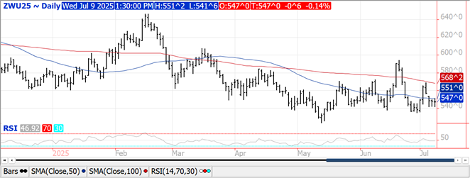 Neither the bulls or bears were able to gain the upper hand in wheat today. Prices were very little changed with all 3 classes experiencing 2 sided trade. KC and MGEX closed with modest gains and CGO with modest losses. Higher trade in Sept-25 CGO was capped at its 50 day MA. A fresh 2 month low in Sept-25 KC however prices held above their contract low from May setting up today’s bounce. The lowest offer for Bangladesh’s wheat tender was just below $269/mt CIF for 50k mt. No purchase yet announced. Ukraine’s Grain Union is forecasting 2025 wheat production at 22.4 mmt, just below the USDA forecast of 23 mmt. After the Trump Administration resumed military aid to Ukraine, Russia blasted Ukraine with several hundred drone attacks. No word on casualties however it evidently didn’t damage Ukraine’s grain infrastructure. Export sales tomorrow are expected to range from 8-20 mil. bu.