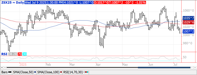 Prices were lower across the complex with many contracts making new lows near the close. Beans were down $.09-$.12, meal was $1 lower while oil was down 70-80 points. Bean and oil spreads softened meal spreads were mixed. Both old and new crop bean futures slipped to fresh 3 month lows. Support for Aug-25 rests at $9.82 ¾, and $9.71 for Nov-25. The US soybean balance sheet has far less wiggle room if US yields do not reached the current USDA est. New contracts lows in Aug-25 meal for a 2nd consecutive session. Aug-25 oil has pulled back to about the midpoint of its 4 week range. Markets braced for more tariff news today however little came. So far about the only new news was Trump warning of a much higher tariffs on Brazilian imports as of “they have not been good to us”. Still awaiting clarity on SRE from the Trump Administrations and its potential impact on bean oil usage for biofuel production. Spot board crush margins (Aug-25) held steady at $1.70 bu. with bean oil PV slipping to 49.7%. New crop margins slipped a penny to $2.01 bu. Ukraine’s Grain Union is forecasting 2025 sunflower seed production at 15.1 mmt, 6.2 mmt of soybeans and rapeseed at 3.0 mmt. Conab is out tomorrow with updated production estimates for Brazil. With SA harvest over I’d expect little change in 24/25 production. Cumulative production for Argentina, Brazil and Paraguay at 228 mmt is up nearly 7% from the previous record last year. Export sales tomorrow are expected to range from 12-36 mil. bu. for beans, 150k-900k tons of meal and 0-30k tons of oil.