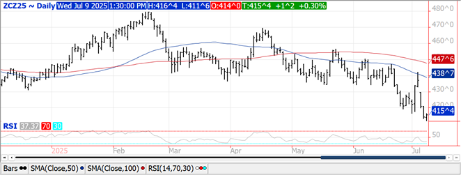 Prices were $.01-$.02 higher in choppy 2 sided trade. Early speculative selling appeared to dry up enabling prices to recover. New contract lows were established for most contracts. Spreads were little changed. US weather remains non-threatening into late July driving yield expectations above the already record levels forecast by the USDA. EIA data showed ethanol production rebounded to 319 mil. gallons, up from 316 mil. the previous week, and up 3% YOY. Production was above expectations and above the pace needed to reach the USDA corn usage est. for a 6th consecutive week. There was 108 mil. bu. of corn used in the production process, or 15.47 mil. bu. per day, above the 15.06 needed to reach the USDA forecast of 5.50 bil. Ethanol stocks slipped to 24.0 mil. barrels, in line with expectations and just above the 23.6 mb YA. Implied gasoline usage rose 6% LW to 9.159 tbd, however was still down 2.5% YOY. Ukraine’s Grain Union is forecasting total grain production of 83.1 mmt in 2025, of that corn production is expected to reach 29.3 mmt, vs. the USDA est. of 30.5 mmt.