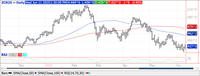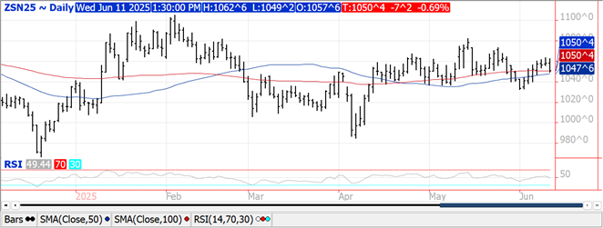 Prices were mixed across the soybean complex. Beans ranged from $.02-$.07 lower with spot July the downside leading making new lows into the close. Meal was down $1-$2 while oil was up 20-25 points. Spreads weakened in beans and meal while slightly firmer in oil. July soybeans failed to trade above the previous sessions high for the first time in over a week while closing right at its 100 day MA. Nov-25 beans continue to consolidate near its 50 and 100 day MA’s. July bean oil has stretched out to a new high for the month with resistance at the 50 day MA at 48.36. Spot July meal remains stuck between $290-$300 per ton for 7 weeks. Pres. Trump took to social media stating China will supply the US with rare earth materials and magnets while the US will allow Chinese students access to US Universities. US tariffs will remain at 55% for Chinese imports while China’s tariffs on US imports will hold at 10%. At midday US Treasury Sec. Bessent stated that trade negotiations with China will most likely be a much longer progress as the US looks to narrow the $295 bil. trade deficit from 2024 with the world’s 2nd largest economy. US weather remains mostly favorable as the nation’s midsection will see a good mix of rain and sunshine over the next few weeks.
