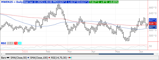 Prices were mixed in CGO and KC while closing at session highs up $.05-$.06 in MGEX futures. July-25 MGEX closed back above its 100 day MA however held within yesterday’s range. Inside trade for July-25 CGO as well. The USDA has raised their WW production forecast every year in the June report in the last decade. A South Korean Feed group reportedly bought around 60k mt of feed wheat at $255/mt CF for Oct. shipment. Taiwan is reportedly seeking just over 95k mt of US milling wheat for Aug/Sept shipment. Offer deadline is tomorrow.