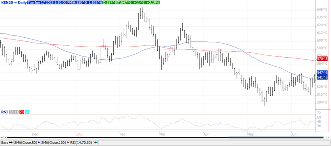 Prices ranged from $.08 higher in MGEX to $.13 better in CGO. July-25 CGO and KC reached their highest price level in a week. Near term resistance rests at $5.57 ¾ for CGO and $5.51 for KC. Winter wheat ratings slipped 2% to 52% G/E vs. expectations for no change. The percentage of the crop rated poor or VP increased 3% to 19% as there was also a 1% drop in fair. Despite the drop, overall ratings are still above their 5-year Ave. Conditions improved in only 3 states, declined in 13 while holding steady in 2. Harvest advanced 6% to 10% complete, the slowest in 4 years and well below the 25% YA and 5-year Ave. of 16%. Spring wheat conditions improved 4% to 57% G/E, above expectations. With the improvement overall conditions are slightly above their 5-year Ave. Wire services are reporting Algeria has bought between 550k-570k mt of milling wheat at their nominal tender for only 50k mt. Prices are reportedly near $244.50 – $245/mt CF with most of the grain sourced from the Black Sea region for July/Aug shipment.