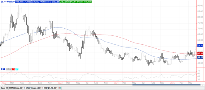 Prices were mixed across the complex today. Beans ranged from $.04-$.08 higher, meal was $1-$2 better while bean oil slipped 20-30 points. July-25 beans rejected trade below yesterday’s low setting up today’s bounce. Nov-25 beans traded to a fresh 4 ½ month high with next resistance at $10.75 ¾. A new 20 month high for July-25 oil before correcting. New contract low for July-25 meal before bouncing. Next support is at $278.50. The lower price has uncovered some export demand as the USDA announced the sale of 120k mt of meal to an unknown buyer. Crush margins took a breather today backing off $.05 in the spot contracts to $1.56 bu. with bean oil PV slipping to 49%. New crop margins dropped $.03 ½ to $1.98 bu. US weather is mostly favorable with much of the nation’s midsection expected to receive .75-2” of rain this week. Extreme heat will impact the WCB and southern plains with at least a couple of days of triple digit heat for KS and W. NE by late this week. Extended forecasts show some cooling in the WCB for the last week of June with above normal temps to remain for the east. Normal to above normal precipitation is expected across the continental US. Soybean plantings advanced only 3% to 93% complete, vs. 92% YA and the 5-year Ave. of 94%. According to USDA data there remains just over 5.8 mil. acres of soybeans left to plant. Over 2.3 mil. acres are in IL, IN, OH, and MO where the final planting dates for crop insurance on June 20th is quickly approaching. The slow pace to winter wheat harvest has also contributed to the slower soybean plantings in double crop areas. The market is attempting to give US farmers the incentive to get these acres planted in the event trendline yields are not attained resulting in a considerably tight balance sheet. Crop ratings declined 2% to 66% G/E while expectations were for a 1% improvement. Ratings improved in only 4 states, declined in 11 while holding steady in 3. Biggest declines were in LA and MI both down 9% while WI was down 7%. EU soybean imports as of June 15th at 13.6 mmt are up 7% from YA. Meal imports at 18.6 mmt are up 26.5% YOY.
