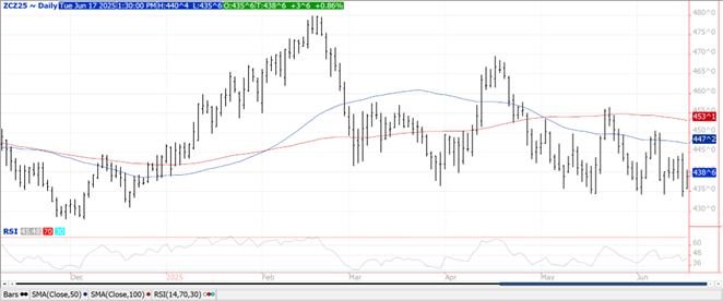 Prices ranged from down $.03 in spot July to up $.04 in new crop as spreads weakened. July fell back to a $.07 discount to Dec-25 pressured by easing Gulf basis levels. July-25 did hold support above LW’s low at $4.29 ¼. Inside trade for Dec-25. Ratings improved 1% to 72% G/E in line with expectations. Conditions improved in 9 states, declined in 7 while holding steady in 2. Overall ratings remain slightly above their historical average. EU corn imports for 24/25 as of June 15th at 19 mmt are up 6% from YA. With a few weeks left in the old crop MY EU corn imports will likely come in very close to the USDA forecast of 20 mmt. Funds sold roughly 21k contracts yesterday extending their short position to over 190k for the 1st time since Aug. Tomorrow’s EIA report is expected to show ethanol production range between 329-331 mil. gallons, holding at or above the previous week’s record production of 329 mil. gallons. The market continues to shrug off tight global stocks as strong demand shifts toward SA origin. IMO at these price levels the market is discounting higher, possibly much higher 2nd crop production in Brazil helping ease the global supply tightness. Growing crop prospects here in the US is also weighing on market sentiment.