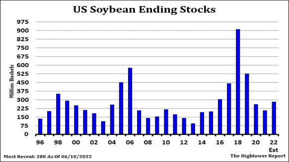 Soybean, soymeal and soyoil futures ended lower. 2 week US Midwest forecast calls for below normal rains but normal temps. One forecaster suggested normal US Midwest July rains which has weighed on grain futures. Continued slow US weekly soybean exports is also weighing on futures. Cash US soybean values remain strong and over delivery prices. Inflation concerns and higher US interest rates could slow global food and fuel demand. Weekly US soybean exports were 15.7 mil bu vs 7.5 last year. Season to date exports are 1,870 vs 2,201 ly or down 15 pct. USDA goal is 2,170 vs 2,261 ly or down 5 pct. Last week USDA rated the US soybean crop 70 pct G/E. Some could see a slight decline. June 30 USDA will est US soybean acres and June 1 stocks. Analyst estimate US soybean acres up .5 from USDA March est of 91.0. Stocks could be near 970 mil bu vs 769 last year.