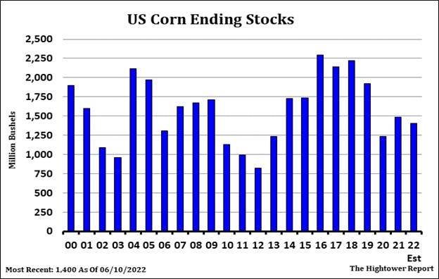Corn futures ended lower. 2 week US Midwest forecast call for below normal rains but normal temps. One forecast suggested normal US Midwest July rains which has weighed on grain futures. Continued slow US weekly corn exports versus expectations is also weighing on futures. Cash corn values remain strong and over delivery prices. US corn feeders, ethanol and export buyers continue to compete for declining stocks with US farmer a reluctant seller. Most US producers see a good 2022 crop in the field but recent hot and dry weather keeps their price outlook bullish. US farmers have also sold more 2022 crop to date then normal at lower prices. Inflation concerns and higher US interest rates Could slow demand. Weekly US corn exports were 46.6 mil bu vs 69.9 last year. Season to date exports are 1,817 vs 2,103 ly or down 14 pct. USDA goal is 2,450 vs 2,753 ly or down 11 pct. Last week USDA rated the US corn crop 72 pct G/E. Some could see a slight decline. June 30 USDA will est US corn acres and June 1 stocks. Analyst estimate US corn acres either down 1.0 or up 1.0 from USDA March est but still below last year. Stocks could be near 4,320 mil bu vs 4,111 last year. Key to spreads and basis is actual stocks number and pct on and off farm.