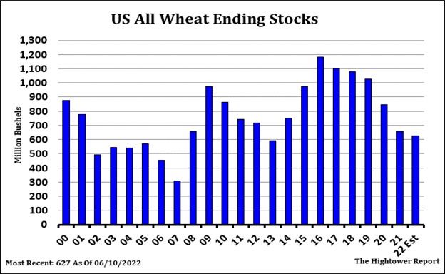 Wheat futures ended lower. Matif wheat fell to its lowest close since April, following the US due to more harvest pressure from the long weekend, even though Kansas yields were disappointing. A cooler central US Midwest forecast weighed on corn and beans which sent additional spillover selling into Europe. The northern half of France is seeing welcome rains, private Russian crop estimates continue to rise, and there were yet more newswire articles quoting unnamed officials projecting 30-35 mmt of grain to be shipped from Ukraine in the next 6-8 months, once the export corridors are in place. Reports suggest this might be achieved at meetings in Russia and Turkey over the next 10 days. Weekly US wheat exports were 12.1 mil bu vs 20.3 last year. Season to date exports are 35 vs 45 ly. USDA goal is 775 vs 805 ly. Last week USDA rated the US spring wheat crop 54 pct G/E and US winter wheat harvest at 10 pct done. Some could see harvest closer to 33 pct. June 30 USDA will est US wheat acres and June 1 stocks. Analyst estimate US wheat acres either down 1.0 mil from USDA March est and near last year. Stocks could be near 640 mil bu vs 845 last year.