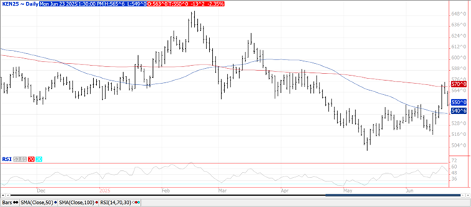 : Prices were $.11-$.15 lower across the 3 classes in volatile trade. The July-25 contracts for all 3 classes have all traded back to about the midpoint of this month’s range. Ukraine’s exports for the 24/25 MY as of June 23rd have reached 15.6 mmt, down 15% YOY while likely coming in below the USDA forecast of 16.5 mmt. Egypt’s Ag. Minister state they have imported 4.9 mmt of wheat so far this year, down 31% YOY. MARS has raised their EU soft wheat yield forecast to 6.08 mt/HA, up from last month’s forecast of 6.04 mt/HA. Export inspections fell to 9 mil. bu., below expectations and below the 16 mil. needed to reach the USDA forecast of 825 mil. bu. YTD inspections at 31 mil. bu. are down 20% from YA, vs. the USDA forecast of up 1%.