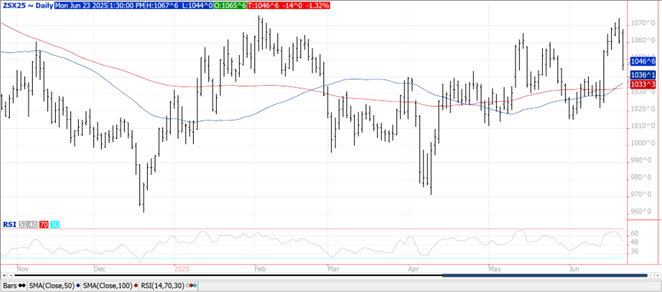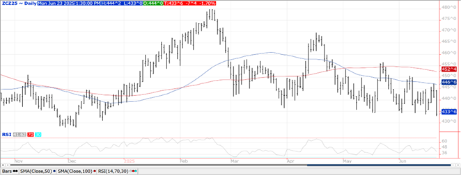 Prices were down $.07-$.10 with spot July once again the downside leader. Spreads continue to weaken with July/Dec slipping to a new low at ($.16). New contract low for July-25 with the spot contract slipping to a 7 month low on the weekly chart. For now Dec-25 held support above its contract low at $4.28. Non-threatening US weather continues to weigh on commodity valuations. Spot crude oil was down over $5 per barrel after surging to a 6 month high in overnight trade. As of now the Straits of Hormuz remains open while Iran’s ability to respond to the US/Israeli attacks appears limited. Ukraine’s corn exports for the 24/25 MY as of June 23rd have reached 21.7 mmt, down 25.7% YOY while closing in on the USDA forecast of 22 mmt for the MY that expires at month end. US export inspections slipped to 58 mil. bu. however were in line with expectations and above the 40 mil. bu. needed to reach the USDA forecast of 2.650 bil. bu. YTD inspections at 2.108 bil. up 29% from YA vs. the USDA forecast of up 16%. Largest takers were Mexico – 13 mil., Japan – 10 mil., and Colombia – 6 mil.