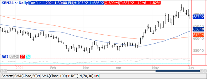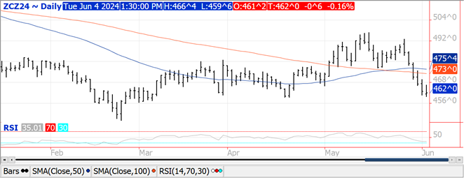 Prices finished $.01 lower in choppy 2 sided trade. Inside trade for July-24 corn. Near term resistance is at the 50 and 100 MA’s, currently $4.52 ½ with support at the April low of $4.35 ¾. Dec-24 carved out a fresh 6 week low however held above the April low at $4.59 ½. First resistance is at the 100 day MA at $4.73. Most of Brazil and Argentina will be dry for the next week to 10 days allowing harvest to accelerate. The drought in Mexico will likely only deepen into mid-June. Corn plantings at 91% complete were in line with expectations. Based off March intentions and today’s progress report their remains 1.2 mil. acres left to plant in IL and .9 mil. in IA. 75% of the crop was rated G/E, in line with our expectations however above the Ave. trade guess of 70%. The crop condition index at 83.5 matches the highest for the first week in June since 2020. A South Korean Feed group reportedly purchased 133k mt of SA or South African feed corn for Oct-24 shipment. Tomorrow’s EIA report is expected to show ethanol production last week was in a range from 1,068 – 1,073 tbd vs. 1,068 tbd the previous week. EU corn imports since last July have reached 17.1 mmt, down 32% YOY.