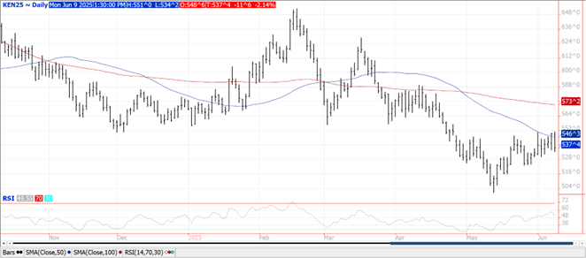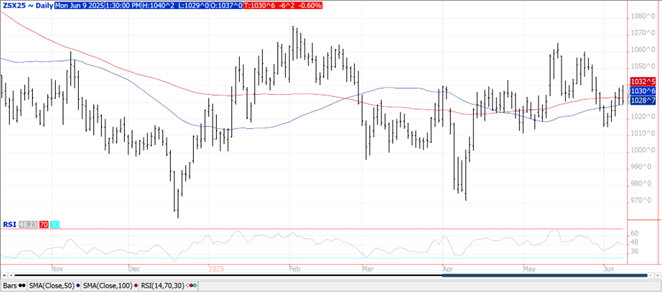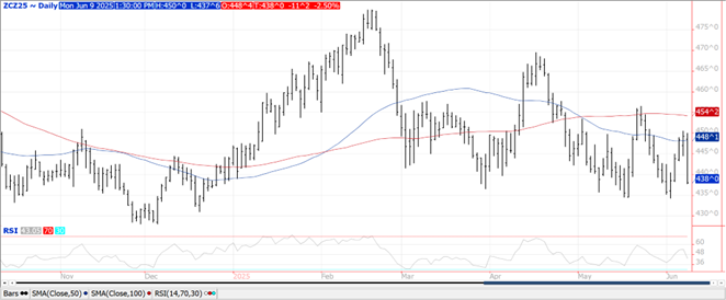 Prices ranged from down $.10-$.13 across the 3 classes today. July-25 CGO overnight rejected trade above the May high while stalling out below its 100 day MA resistance at $5.62 ¼. July-25 KC also scratched out a fresh 7 week higher overnight before pulling back. SovEcon raised their 2025 Russian wheat production forecast 1.8 mmt to 82.8 mmt, still just below the USDA est. of 83 mmt. IKAR reports Russia’s wheat export price closed LW at $225/mt, unchanged from the previous week. APK-Inform lowered their 2025 Ukraine wheat production forecast .1 mmt to 21.7 mmt, below the USDA est. of 23 mmt. Export inspections at 10.7 mil. bu. were at the low end of expectations. Roughly 4.5 mil. bu. were for the 24/25 MY which closed out at the end of May, while 6.2 mil. were for 25/26 MY.