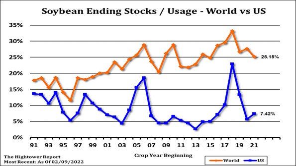 May soybean futures ended near 16.90. May soyoil ended near 76.20. May soymeal futures ended near 454. May board soybean crush margin is near 149. USDA Jan soybean crush is estimated near 193.7 mil bu vs 198.2 in Dec and 196.5 ly. Some now estimate Brazil soybean crop closer to 121 mmt vs USDA 134.0. 44 pct of the crop is harvested vs 25 last year. There is talk that China has returned to US soybean old crop market and are buying US March through April soybeans. This may be due to delays in loading Brazil vessels due to poor logistics. USDA estimates US 2021/22 soybean exports near 2,050 mil bu vs 2,261 ly. Since November USDA has dropped South America soybean crop 20 mmt or 725 mil bu but increased US exports only 10 mil bu. Some analyst could see exports closer to 2,160 which would suggest a carryout closer to 215 than USDA 325.