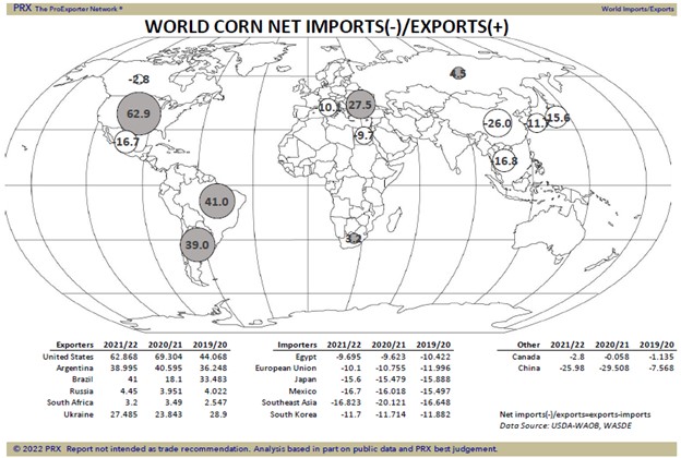 Corn futures ended sharply higher. Speculative traders added to longs post USDA report on talk of lower Ukraine corn exports and lower South America supply. USDA decided to raise World corn crop 1 mmt, drop imports 3 mmt, raise feed use 2 mmt (mostly in Ukraine?) lower exports 3 mmt and carryout 1 mmt. There also concern about planting of the Ukraine corn crop due to many factors beside the War including Farm Managers not knowing where workers are. Weekly US corn export sales were near 84 mil bu. Total commit is near 1,976 mil bu vs 2,217 last year commit is down 13 pct from last year. USDA goal is 2,500 vs 2,753 last year or down 9 pct. Some feel final exports could be closer to 2,800 mil bu which would suggest a carryout closer to 1.070 mil bu vs USDA 1,440. This could suggest higher corn futures. Same group estimates US 2022 scorn acres near 91.5, crop of 14,950, 5,550 feed, 5,300 ethanol use, 2,950 exports and a US 2022/23 corn carryout near 805 mil bu.