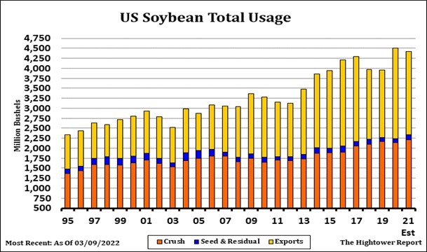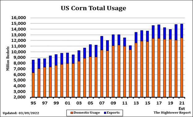 Corn futures ended sharply lower. Rumors that a Ukraine War ceasefire may happen soon offered strong overhead resistance. A ceasefire could open up Black Sea grain exports. Some though feel it could be weeks before grain could be shipped from Ukraine. Recent highs in CK were made of fear that Ukraine may not be able to ship 500 mil bu of corn of which 235 mil bu was to China. Trade estimates US weekly export sales near 700-1,400 mil bu versus 2,143 last week. Weekly US ethanol production was near last weeks pace but up 5 pct versus last year. Stocks were up 2 pct from last week and up 21 pct from last year.