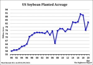 Soybeans, soymeal, soyoil, new crop corn and wheat traded lower. US stocks were higher. US Dollar was lower. Gold was higher. US central bank now sees the economy growing 6.5% this year, and the unemployment rate falling to 4.5% by year’s end. Soybeans traded lower on improving US and South America weather and in front of US weekly export sales. Sales are est near 0-400 mt vs 350 last week. Seasonally, US exports slow and buyers switch to Brazil. Some report China bought 3 US cargoes his week and are 70 percent covered in May and 60 in June. This suggest they may need to buy 6 mmt. China soymeal prices traded higher as hog producers returned as buyers. A year ago nearby soybeans were near 8.00. Next key issue is USDA March 31 report. May nee a US weather problem to make new highs.