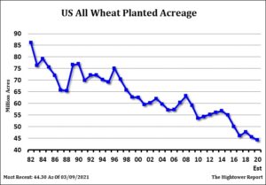 Wheat futures traded lower. Rains across US south plains continues to weigh on prices. Slow demand for US exports also offers resistance. From the Feb high near 6.88 WK has dropped to a low near 6.30. KWK Has dropped from 6.64 to 5.90. MWK has dropped from 6.58 to 6.30. It remains dry across US north plains. Weekly US wheat export sales are est near 150- 500 mt vs 329 last week. Next key USDA report is March 31 acres and stocks report. In April most feel USDA will make few changes to US/World wheat supply and demand. USDA est US 2020/21 wheat carryout near 836 mil bu vs 1,028 ly. HRW stocks near 383 vs 506 ly, SRW 99 vs 105 ly and HRS 258 vs 280 ly. Early guess forUS 2021 wheat is near 1,900 mil bu with a carryout near 790. USDA continues to est World wheat end stocks near 301 mmt vs 300 ly and a crop near 776 mmt vs 764 ly. Some are est World 2021 crop near 780 mmt.