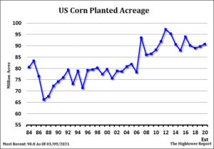 Soybeans, soymeal, soyoil, new crop corn and wheat traded lower. US stocks were higher. US Dollar was lower. Gold was higher. US central bank now sees the economy growing 6.5% this year, and the unemployment rate falling to 4.5% by year’s end. Soybeans traded lower on improving US and South America weather and in front of US weekly export sales. Sales are est near 0-400 mt vs 350 last week. Seasonally, US exports slow and buyers switch to Brazil. Some report China bought 3 US cargoes his week and are 70 percent covered in May and 60 in June. This suggest they may need to buy 6 mmt. China soymeal prices traded higher as hog producers returned as buyers. A year ago nearby soybeans were near 8.00. Next key issue is USDA March 31 report. May nee a US weather problem to make new highs.