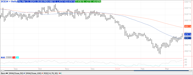 Prices were $.01 – $.02 higher today.  May-24 reached a 5 week high overnight before backing off.  Next resistance is at $4.63.  Dec-24 corn had its highest close in 6 weeks at $4.76 ¾.  Rains are still expected to fill in over central and northern growing regions of Brazil thru month-end helping build subsoil moisture for the 2nd corn crop.   A mix of heavy snow and rain across the NC Midwest over the next 5 days should further ease drought conditions.  Heavy rain across the southern Midwest and Delta region will delay early season planting efforts.  Export sales at 47 mil. bu. were in line with expectations.  YTD commitments at 1.642 bil. are up 19% from YA, vs. the USDA forecast of up 26%.  Commitments represent 78% of the USDA forecast, just below the historical average of 80%.  The US drought monitor showed 34% of corn acres in drought, down 2% from week ago.  This afternoon the BAGE reduced their Argentine production forecast 2.5 mmt to 54 mmt, below the USDA est. of 56 mmt.