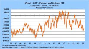 Wheat futures managed small gains before USDA report. Some feel managed funds could be liquidating short wheat futures and short wheat spread before quarter end and USDA report. Most so not look for big surprises in the wheat numbers but wheat futures have seek steep losses from Feb 24 high and could be oversold. Most look for weekly USDA weekly winter wheat crop ratings to improves from last week but 2 week weather forecast is dry. Crop will need to see additional rains to insure above average yields. Trade is looking for US 2021 all wheat acres near 45.0 versus 44.3 ly. Winter wheat 31.8 versus 30.4 last year. Spring wheat 11.6 versus 12.2 last year. Concern is that north plains weather could be drier than normal. Trade est March 1 wheat stocks near 1,272 mil bu versus 1,415 last year. Quarterly food use is est near 237 mil bu vs 236 ly, feed -18 vs -19 last year and exports 211 vs 235 ly.