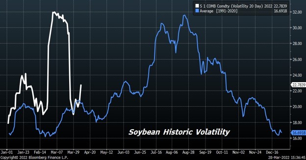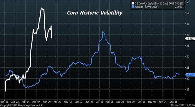 Volatility continues in the corn futures market. Trade again is worried about Ukraine corn exports and if they can plant intended 2022 acres. CK has had an inside day between 7.26 and 7.48. Trade is awaiting USDA estimate of US 2022 corn acres and March 1 stocks. Trade estimates US March 1 corn stocks near 7,877 mil bu versus 7,696 ly. Range 7,630-8.087. USDA tends to find or lose 300 mil bu of corn on recent stocks report. USDA does not count corn in transit or in barges. Trade has been above USDA stocks estimate 10 times in last 17 years and below 7. Trade is also looking for US 2022 corn acres at 92.0 million vs 93.3 ly. Range 89.7 to 93.5. Trade has been above USDA acreage estimate 9 times in last 17 years and below 8. Weekly US corn sales are est at 600-1,000 mt vs 979 last week. There were rumors last week that EU buyers may have bought 800 mt US corn. Trade still waiting for signs that China will switch Ukraine purchases to US. Trade trying to balance the impact lower China economy, increase Brazil export supplies and Ukraine war versus inflation threat and US 2022 weather unknown.