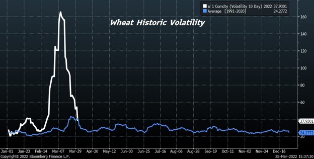 Another wild day in wheat. WK ended near 10.27 with a range of 10.02-10.41.KWK ended near 10.47 with a range of 10.14 to 10.58. MWK ended near 10.58 with a range of 10.5-10.73. Some Wheat is being shipped from Russia. Russia released a document offer humanitarian corridor for Ukraine vessels. Problem in getting vessels on with port mined and loading vessels given damage to port elevators. There was also talk of EU giving subsidies to north Africa wheat buyers to buy wheat. Some said North Africa countries would in turn sell oil to EU. Trade is awaiting USDA estimate of US 2022 wheat acres and March 1 stocks. Trade est March 1 wheat stocks at 1,045 mil bu vs 1.311 ly. Trade has been above USDA 9 times in last 17 years and below 8. Trade est US 2022 wheat acres at 47.8 vs 46.7 ly with range 45.9-48.9.Trade has been above USDA 8 times in last 17 years and below 9.Weekly US old crop wheat sales are est at 50-300 mt vs 155 last week and 150-500 mt new crop vs 367 last week. US south plains 8-14 day weather forecast is warm and dry.