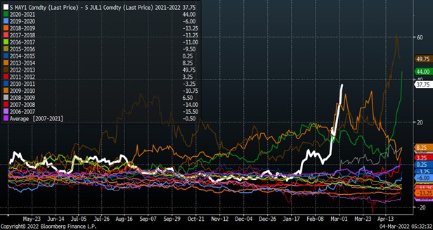 Soybeans and soyoil ended lower on news that the Biden Administration were considering waivers for biofuel mandates to fight food inflation. Global food prices were up 4 pct in Feb and 24 pct vs last year and at all time highs. Higher energy and grains prices pushed the GSI commodity Index over the 2011 high of 760 and near 780. All time high was 893 in 2008. Crude is testing $110. 2008 high was $146. Trade is expecting USDA to raise US soybean demand on March 9 due to lower South America supply. There was talk that China may have ordered its State owned trade group to buy commodities due to Russia and Ukraine War. Spring US insurance soybean prices was all time high and near 14.33. Soybean/corn price ratio is near 2.43 which could suggest a 3 pct increase in US 2022 soybean acres.