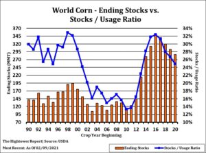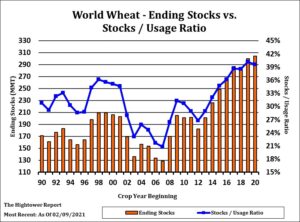 Wheat futures traded higher. Wheat followed higher corn prices and higher energy and stocks prices. Some feel there could be additional buying on concerns about inflation. There could also be increase in food demand after most Americans are vaccinated. There is though some concern about increase wheat feeding reducing wheat for milling. WK held support near 6.46. WK traded back over resistance near 6.51 and closed near 6.53. Next resistance is 6.57. WK remains in a 6.40-6.80 range. KWK traded down to 6.17. KWK did manage to close higher and near 6.26. Next resistance s 6.35. KWK tested the lower end of recent range near 6.20. Higher end is near 6.60. Key will be 2021 north hemisphere weather and Russia wheat export policy. US wheat is not competitive to most World buyers. Large inverses between old and new crop EU and Russia export prices and carries in US makes US new crop prices higher vs Russia. USDA is not expected to make big changes on their March 9 US or World wheat supply and demand.